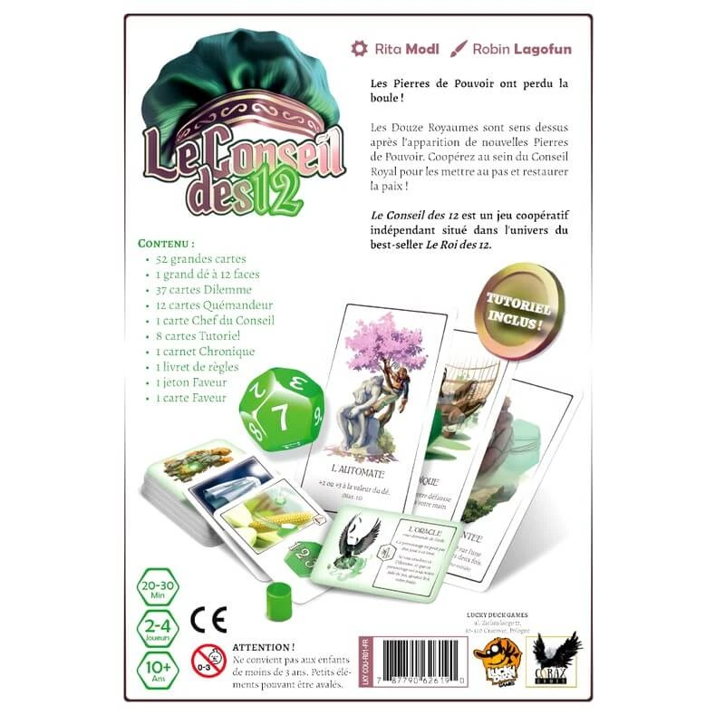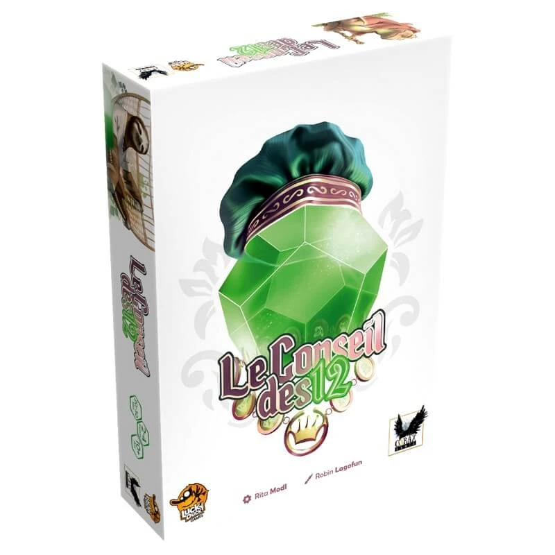 Le Conseil des 12 est la suite du célèbre jeu «Le Roi des 12». Contrairement à son homologue, c’est un jeu entièrement coopératif dont le niveau de difficulté est ajustable en fonction des joueurs autour de la table. Ici, le but est de manipuler collectivement le D12 central en fonction des exigences des cartes en main. Le Conseil des 12 est complètement autonome, mais s’appuie sur les éléments de base populaires du Roi des 12. Les différents personnages y sont joués et annulés, et les dés sont manipulés de la même façon.