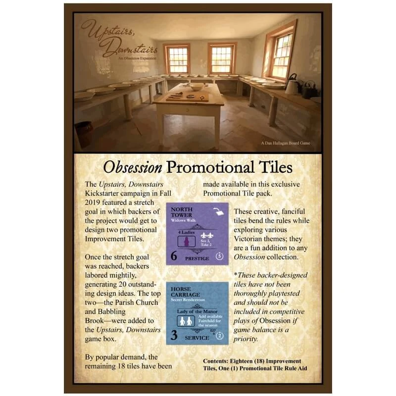 Ces vingt (20) tuiles promotionnelles ont été développées dans le cadre d’un objectif élargi lors de la campagne Kickstarter 2019 de Upstairs, Downstairs.
