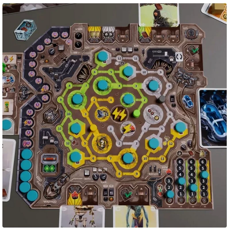 Les usines de construction exploitent la puissance des terrains environnants, faisant avancer votre marqueur sur l’une des trois pistes de machines. Cela peut débloquer des machines qui peuvent être activées, en utilisant de l’énergie.
