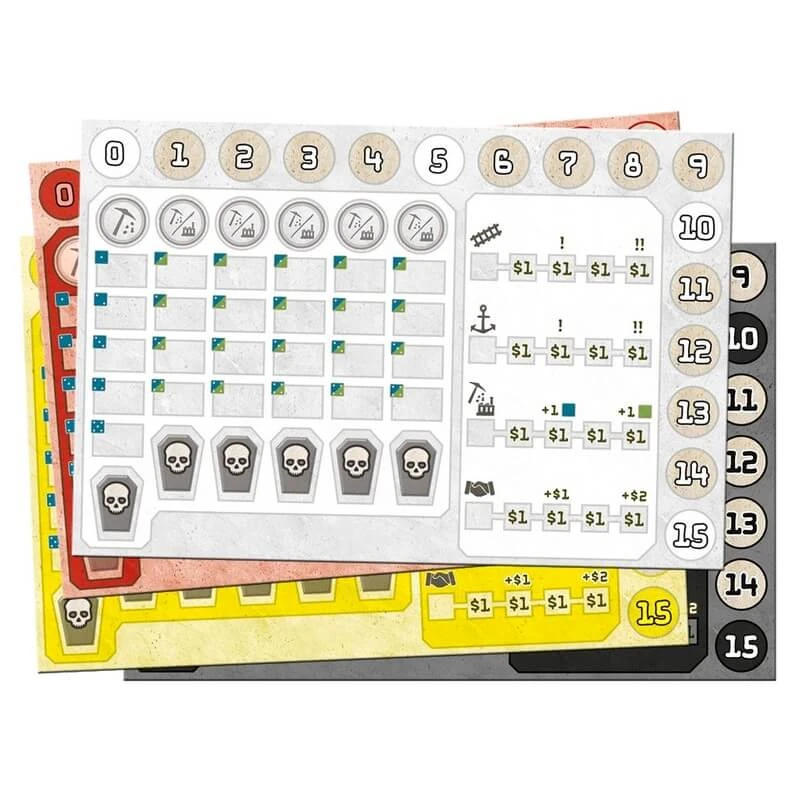 - 4 « sets de joueurs », chacun avec 32 marqueurs (4 jetons de ressources, 12 rails, 6 mines, 5 moulins, 5 ports)