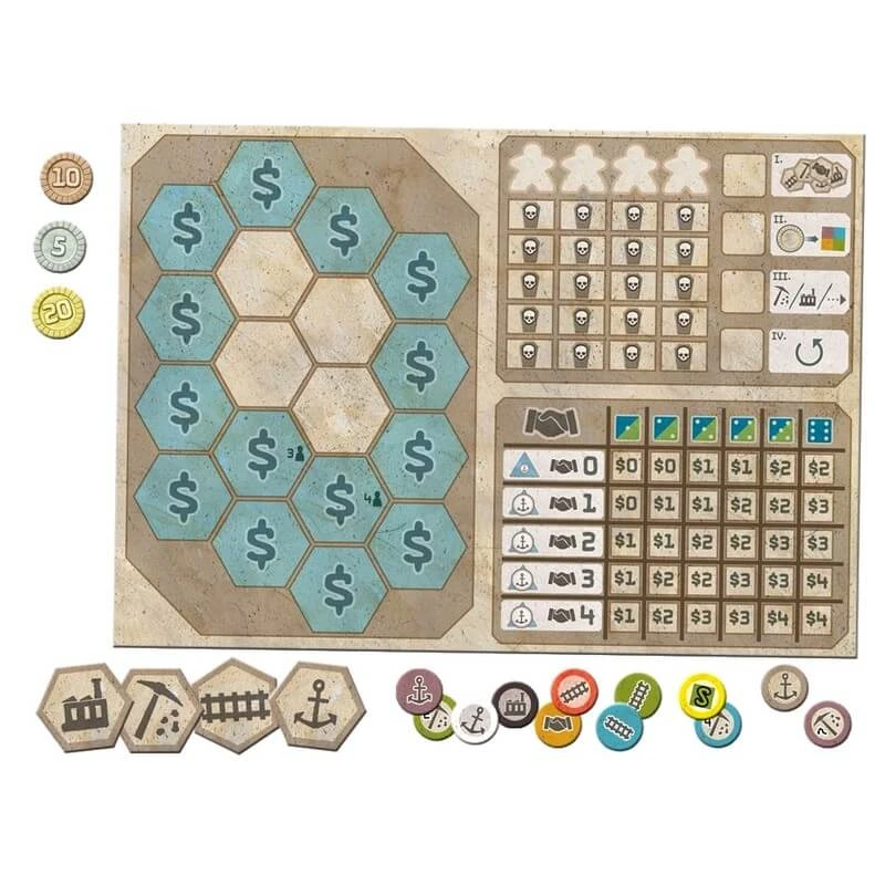 - 6 Marqueurs d’action (2 actions mines, 2 actions ferroviaires, 1 action moulins, 1 action portuaire)